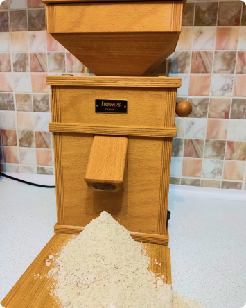 Высушенное зерно перемалывается в мукомолке с каменными жерновами